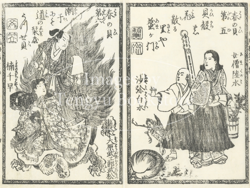 中国四大奇書の一つ「金瓶梅」を翻案した絵入草双紙である本作の挿絵は、浮世絵師としても知られる歌川国安(1794-1832)と歌川国貞(三代目歌川豊国/1786-1865)によるもの。