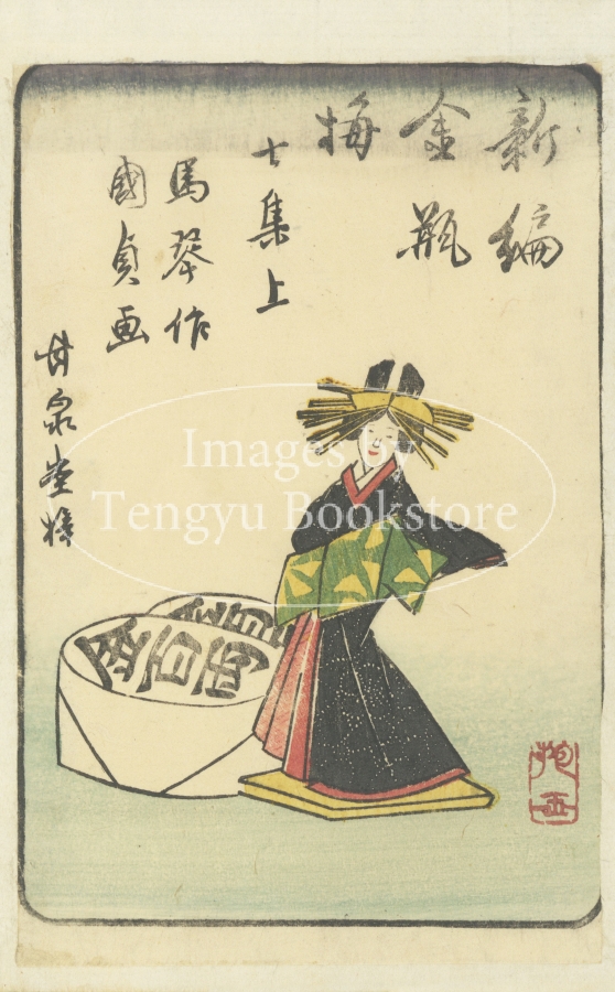 中国四大奇書の一つ「金瓶梅」を翻案した絵入草双紙である本作の挿絵は、浮世絵師としても知られる歌川国安(1794-1832)と歌川国貞(三代目歌川豊国/1786-1865)によるもの。