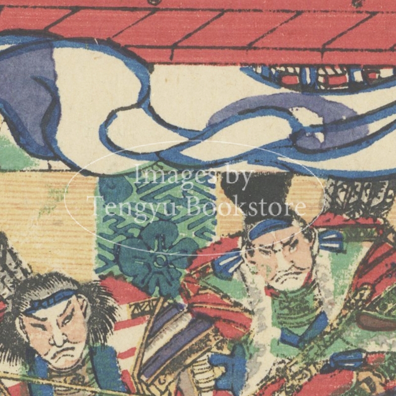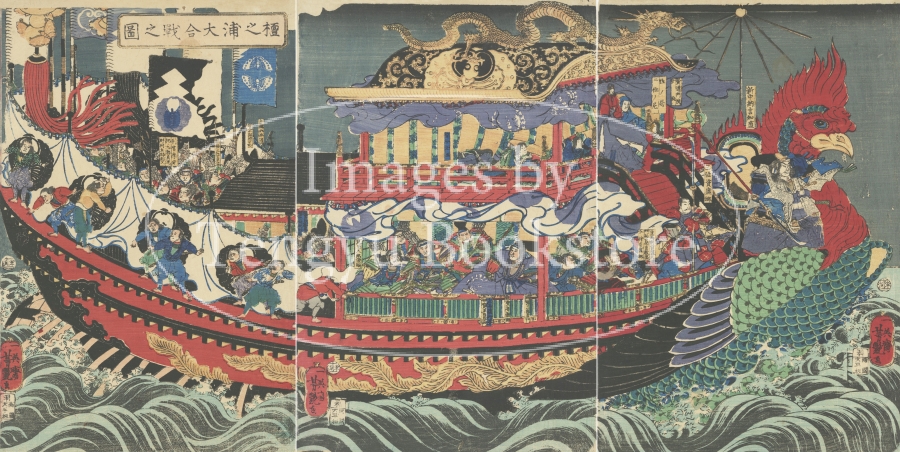 江戸末期に歌川国芳の門人として活躍した浮世絵師 歌川芳艶(1822-1866)による、三枚続の浮世絵。源平合戦における、壇ノ浦の戦いを題材にしたもの。