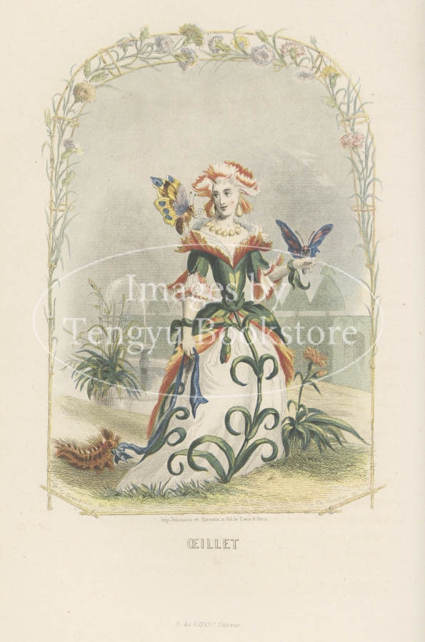 擬人化動物のイラストを得意としたグランヴィルが最晩年に取り組んだ本作は、「花」を題材にした連作。擬人化した姿を与えられた花の精たちの奇妙で愛らしい物語を描いた本書は、刊行当時高い人気を博した、グランヴィルの代表作の一つです。