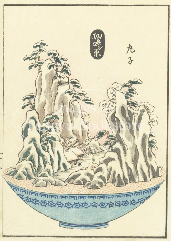 盆の上に石や木を配して山水風景を作る中国由来の盆栽「占景盤」を趣味とした大阪の人、木村唐船(伝記不詳)が製作した鉢山水の数々を模写したもの。