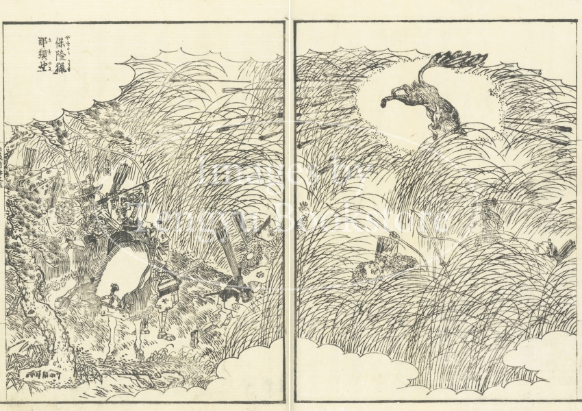 江戸後期に刊行された読本「絵本玉藻譚」のからの一枚。九尾の狐の化身であるとされた玉藻前(たまものまえ)の伝説を描いたもの。挿絵を手がけたのは、大阪の浮世絵師 岡田玉山(1737-1808/1812)です。