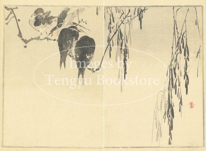 明治から大正にかけての日本画家 渡辺省亭 (1852-1918)による絵手本「省亭花鳥画譜」からの一枚。ヨーロッパへの輸出用工芸品の図案なども手掛けた渡辺省亭は、洋風表現を取り入れた独自の花鳥画で海外でも高い人気を博し、印象派にも影響を与えた日本画家です。