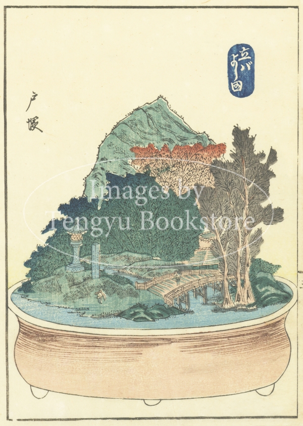 江戸から京都に至る街道「東海道」中の53箇所の宿場を題材にした盆栽図集「東海道五十三駅鉢山図絵(とうかいどうごじゅうさんつぎはちやまずえ)」中の1枚。