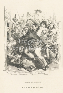 19世紀フランスの挿絵画家J.J.グランヴィル(1803-1847)が挿絵を手掛けた小説「ジェローム・パチュロ 社会的地位を求めて」の挿絵。下着屋の息子ジェローム・パチュロがひたすらに立身出世を目指して 文学界やジャーナリズムなど様々な世界に首を突っ込んでは失敗を続ける様子を通して19世紀フランスの社会を戯画的に描いた、当時ベストセラーとなった風刺小説です。
