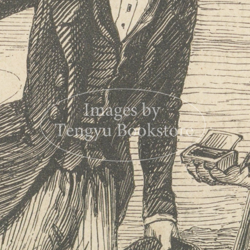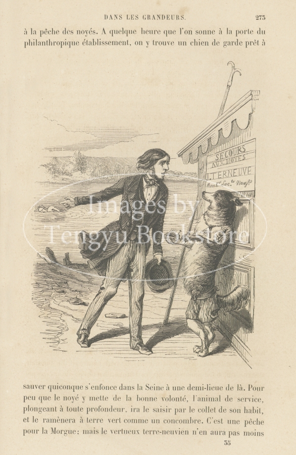19世紀フランスの挿絵画家J.J.グランヴィル(1803-1847)が挿絵を手掛けた小説「ジェローム・パチュロ 社会的地位を求めて」の挿絵。下着屋の息子ジェローム・パチュロがひたすらに立身出世を目指して 文学界やジャーナリズムなど様々な世界に首を突っ込んでは失敗を続ける様子を通して19世紀フランスの社会を戯画的に描いた、当時ベストセラーとなった風刺小説です。