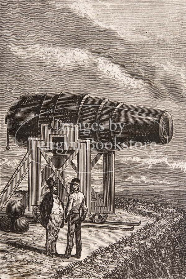 SF小説の祖とも呼ばれる19世紀末フランスの作家ジュール・ヴェルヌ(1828-1905)の冒険小説「月世界旅行」の挿絵。アメリカの火器愛好家団体「大砲クラブ」が発案した月に向かって有人の砲弾を打ち上げる計画を描いた"De la Terre a la Lune"(「地球から月へ」)と、月へと出発した砲弾の乗組員たちが地球に帰り着くまでの物語"Autour de la Lune"(「月を回って」)からなる2部作。