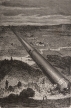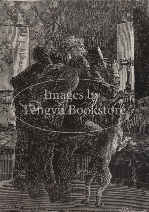 SF小説の祖とも呼ばれる19世紀末フランスの作家ジュール・ヴェルヌ(1828-1905)の冒険小説「月世界旅行」の挿絵。アメリカの火器愛好家団体「大砲クラブ」が発案した月に向かって有人の砲弾を打ち上げる計画を描いた"De la Terre a la Lune"(「地球から月へ」)と、月へと出発した砲弾の乗組員たちが地球に帰り着くまでの物語"Autour de la Lune"(「月を回って」)からなる2部作。