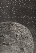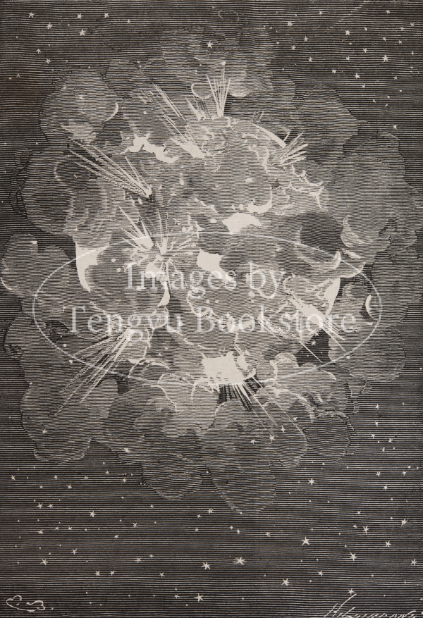 SF小説の祖とも呼ばれる19世紀末フランスの作家ジュール・ヴェルヌ(1828-1905)の冒険小説「月世界旅行」の挿絵。アメリカの火器愛好家団体「大砲クラブ」が発案した月に向かって有人の砲弾を打ち上げる計画を描いた"De la Terre a la Lune"(「地球から月へ」)と、月へと出発した砲弾の乗組員たちが地球に帰り着くまでの物語"Autour de la Lune"(「月を回って」)からなる2部作。