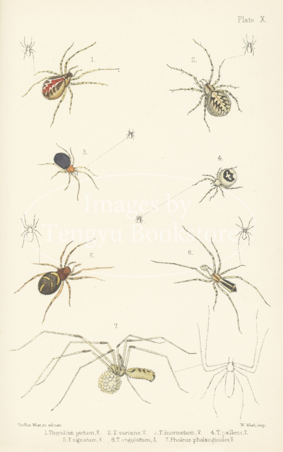 19世紀イギリスの昆虫学者E.F.ステーブリーによるイギリス蜘蛛図鑑中の一図。イギリス、アイルランドに生息する蜘蛛を石版図版をもちいて紹介したもの。