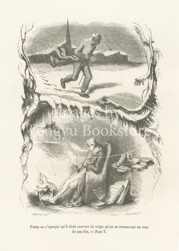 19世紀フランスの挿絵画家トニー・ジョアノ(1803-1852)の挿絵本「お好みの地への旅」中の1図。作家アルフレッド・ド・ミュッセによる物語に、当時人気の高かったトニー・ジョアノが多数のイラストを付けた本書は、グロテスクな怪物たちが跋扈する幻想旅行譚です。