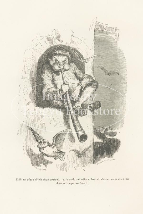 19世紀フランスの挿絵画家トニー・ジョアノ(1803-1852)の挿絵本「お好みの地への旅」中の1図。作家アルフレッド・ド・ミュッセによる物語に、当時人気の高かったトニー・ジョアノが多数のイラストを付けた本書は、グロテスクな怪物たちが跋扈する幻想旅行譚です。