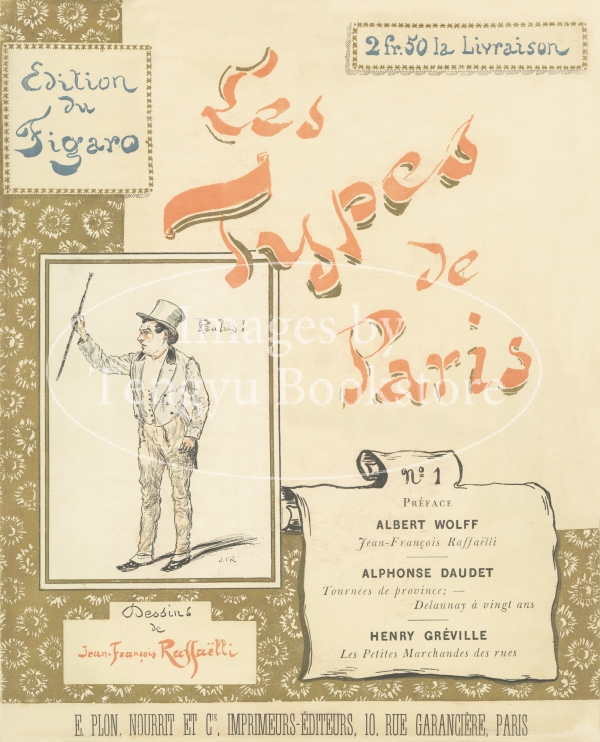19世紀末フランスの画家ジャン・フランソワ・ラファエリ(1850-1924)と19世紀末フランスを代表する文学者たちによる画文集「パリっ子の典型」の表紙。全10巻の分冊で発行された本書は、パリの市井の人々を描くことを得意としたラファエリのイラストを中心に、毎号エミール・ゾラやモーパッサン、ドーデー、マラルメ、ユイスマンスといった豪華な作家たちによるエッセイや詩を掲載したもの。