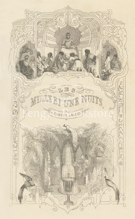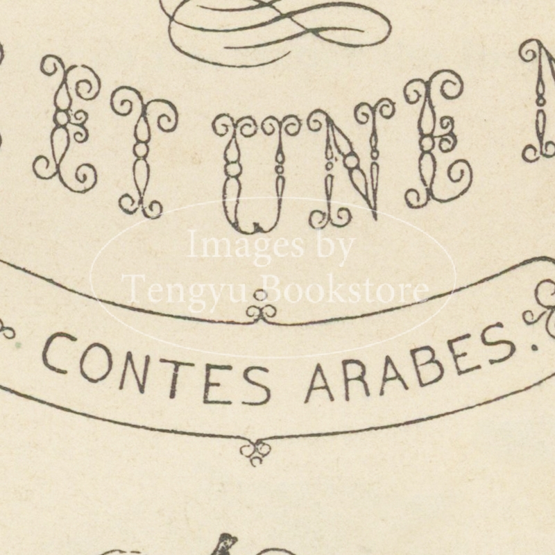 英訳タイトル「アラビアンナイト」として有名なアラビア世界の説話集「千夜一夜物語」の19世紀フランス刊行版挿絵本の扉ページ。アラビア語原文を翻訳し、初めてヨーロッパ世界に本作を紹介した17世紀の東洋学者アントワーヌ・ガランによるフランス語訳版。
