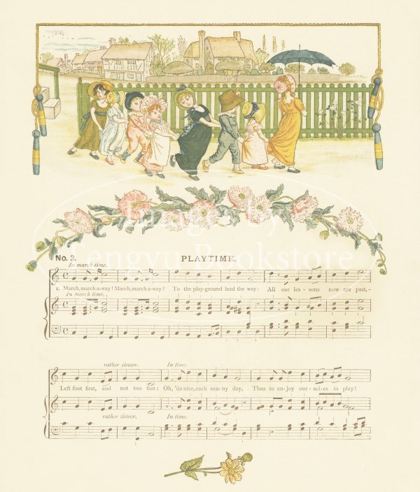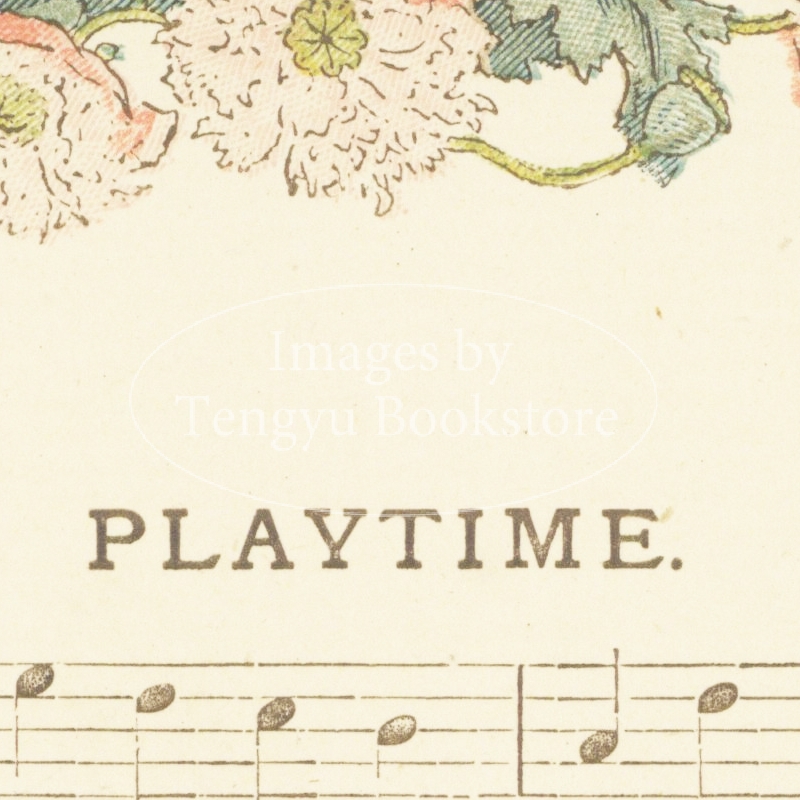 19世紀イギリスを代表する絵本作家ケイト・グリーナウェイ(1846-1901)の挿絵本「子供の一日」の1ページ。19世紀末イギリスの作曲家マイルズ・B・フォスターによる歌曲をグリーナウェイのイラストで飾った楽譜集です。