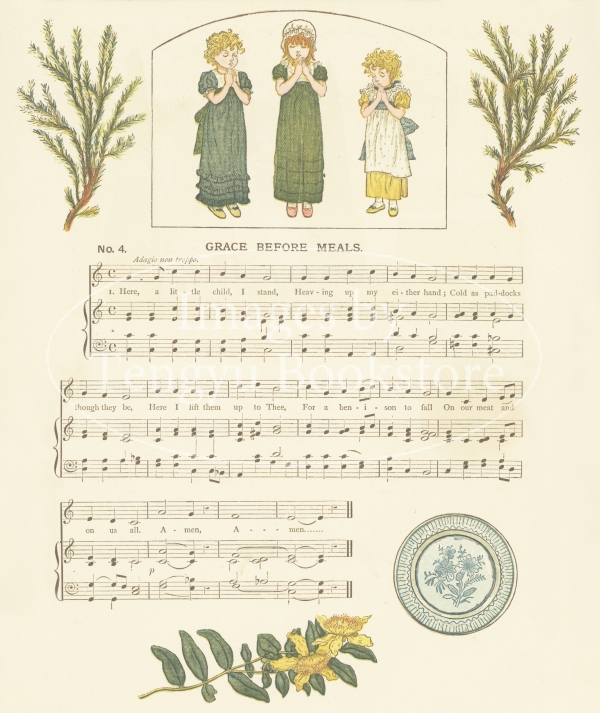 19世紀イギリスを代表する絵本作家ケイト・グリーナウェイ(1846-1901)の挿絵本「子供の一日」の1ページ。19世紀末イギリスの作曲家マイルズ・B・フォスターによる歌曲をグリーナウェイのイラストで飾った楽譜集です。