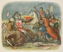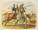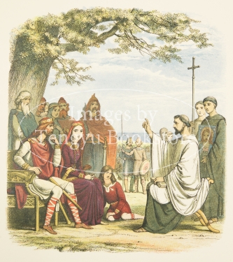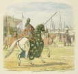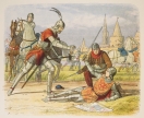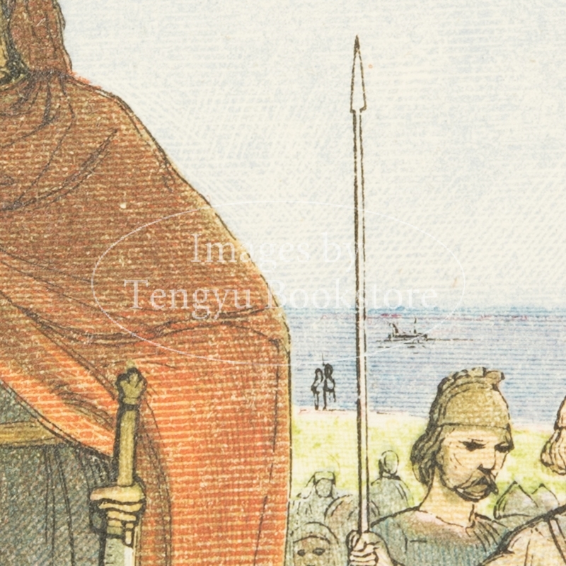 紀元前から15世紀までのイギリスの歴史を挿絵入りで語った19世紀中期刊行の歴史書「英国年代記」初版の挿絵。同時代の作家コナン・ドイルの叔父であり、同じく挿絵画家のリチャード・ドイルの兄でもあった画家ジェームズ・E・ドイル(1822-1892)が挿絵と本文を手掛けた本書は、色鮮やかで精密な多色刷木版印刷によるカラー挿絵を多用した美書。
