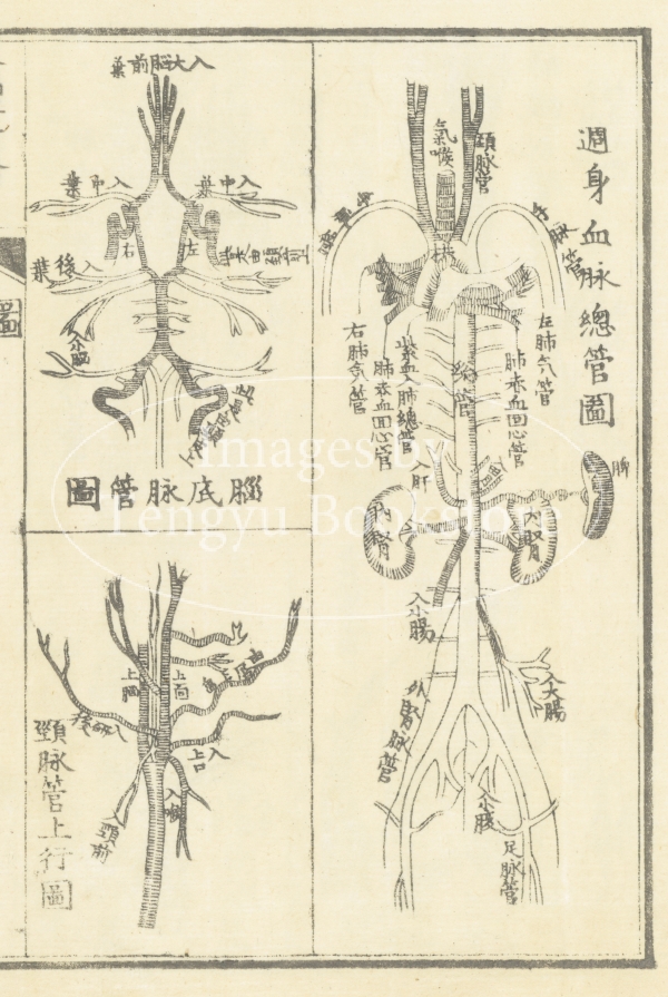 19世紀中期に中国で刊行された医学書「全体新論」の日本翻刻版「全体新論」の挿絵。。イギリス人宣教師・医師のベンジャミン・ホブソン(1816-1873)が著した本書は、中国に初めて西洋の解剖学を紹介したもの。ホブソンは清代中国で働きながら漢文で医学書を著し、本書において初めて西洋医学を中国に伝えたとされています。彼の著作は日本の医学にも大きな影響を与えました。