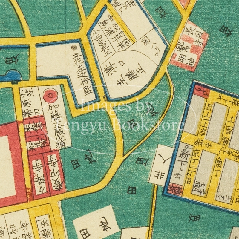 中でも江戸の書店 金鱗堂(尾張屋清七)によって出版された尾張屋版は代表的な江戸切絵図としてもっとも有名なもの。嘉永2年(1849年)に刊行を開始して以来、明治3年(1870年)まで改正と出版を続けた尾張屋版 江戸切絵図は、地図としての用途だけでなく、江戸土産としても喜ばれ、当時高い人気を博しました。