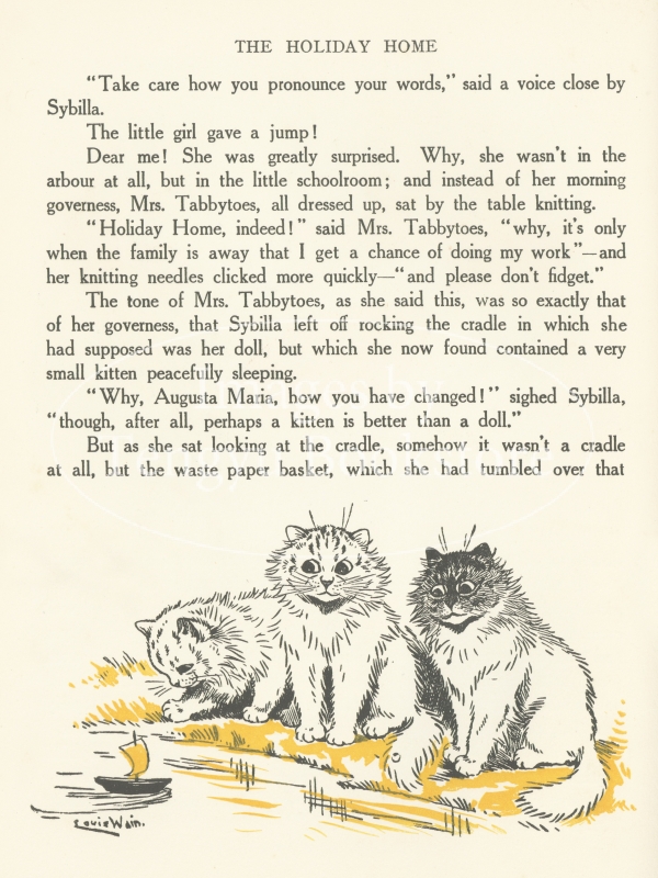 19世紀末~20世紀初期イギリスのイラストレーター、ルイス・ウェイン(1860-1936)の作品集中の1ページ。本書は、猫の画家として当時一世を風靡したルイス・ウェインによる短い児童向け絵物語を多数収録したもの。