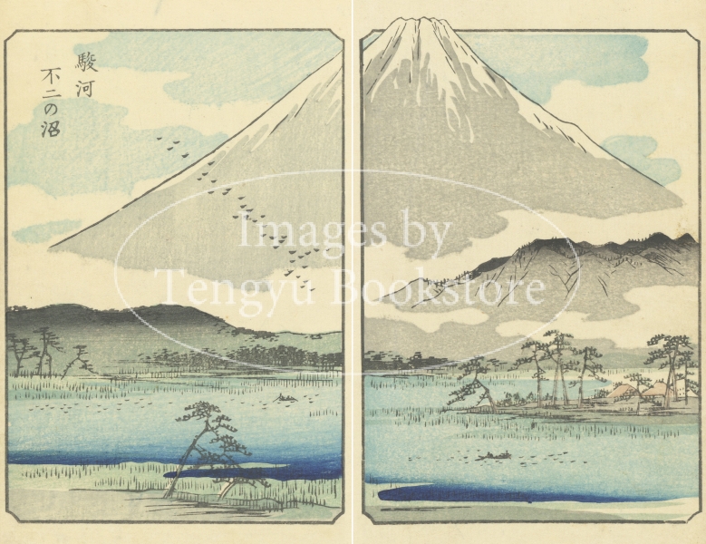 江戸時代後期の人気浮世絵師 歌川広重(1797-1858)の画集「冨士見百図」中の1枚。様々な土地から見える富士山の姿をありのままに写生した本書は、風景浮世絵の大家である広重の本領が発揮された広重晩年の名品です。