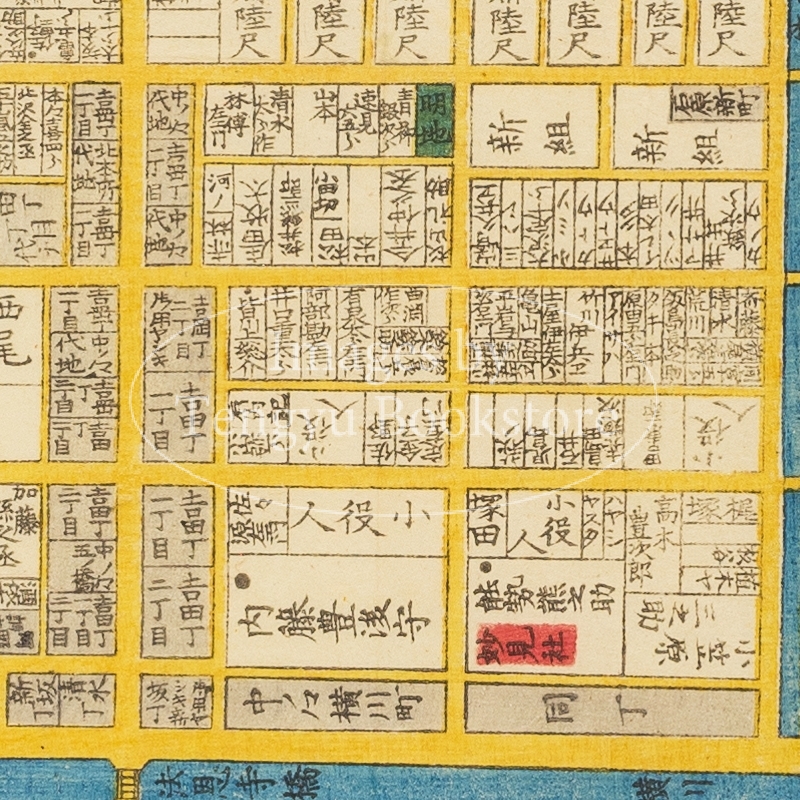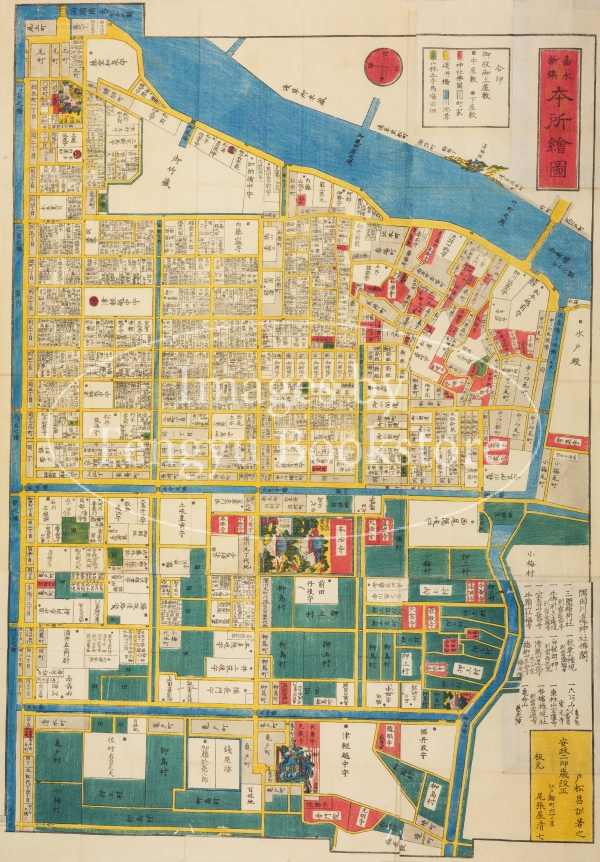 中でも江戸の書店 金鱗堂(尾張屋清七)によって出版された尾張屋版は代表的な江戸切絵図としてもっとも有名なもの。嘉永2年(1849年)に刊行を開始して以来、明治3年(1870年)まで改正と出版を続けた尾張屋版 江戸切絵図は、地図としての用途だけでなく、江戸土産としても喜ばれ、当時高い人気を博しました。