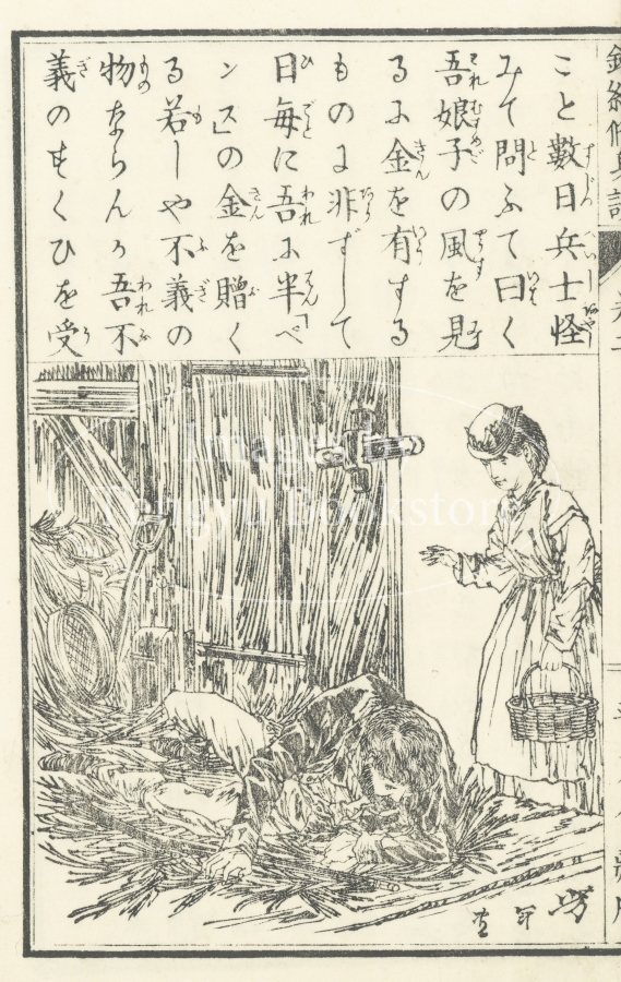 幕末・明治を代表する浮世絵師 月岡芳年(1839-1892)が手掛けた明治期読本「錦絵修身談」の挿絵。本書は修身教育に役立つ美談を、日本をはじめ、中国、欧米など世界各国から集めたもの。