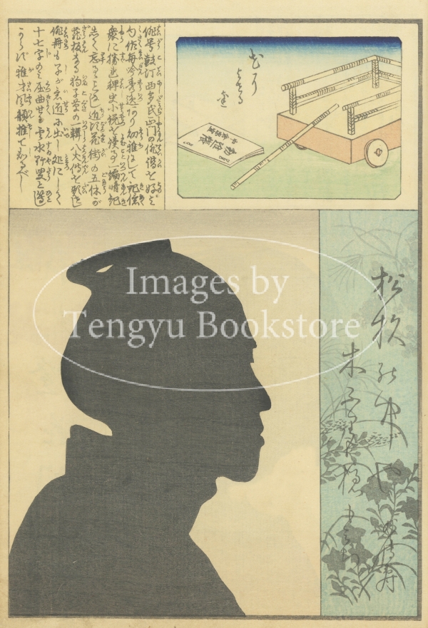 江戸末期の文化人たちの肖像影絵集「くまなき影」中の1ページ。「興画合」という文人たちの遊びの会を主宰していたパトロン波月亭花雪の3周忌記念として制作された本書は、「興画合」会の参加者たちを略伝と影絵を用いて紹介したもの。