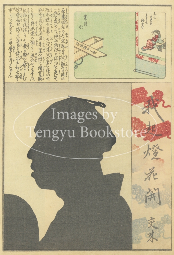 江戸末期の文化人たちの肖像影絵集「くまなき影」中の1ページ。「興画合」という文人たちの遊びの会を主宰していたパトロン波月亭花雪の3周忌記念として制作された本書は、「興画合」会の参加者たちを略伝と影絵を用いて紹介したもの。