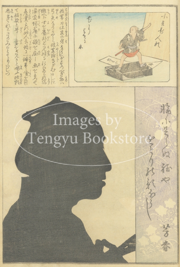江戸末期の文化人たちの肖像影絵集「くまなき影」中の1ページ。「興画合」という文人たちの遊びの会を主宰していたパトロン波月亭花雪の3周忌記念として制作された本書は、「興画合」会の参加者たちを略伝と影絵を用いて紹介したもの。