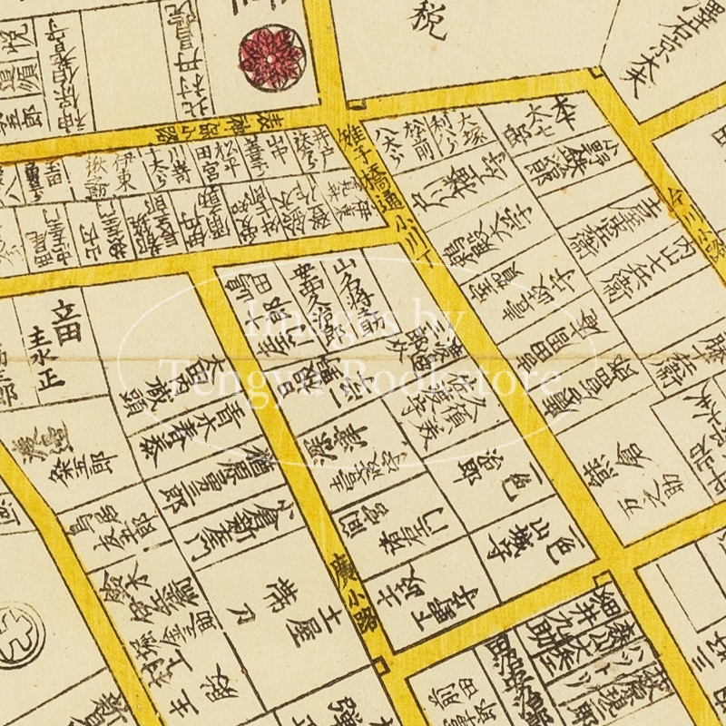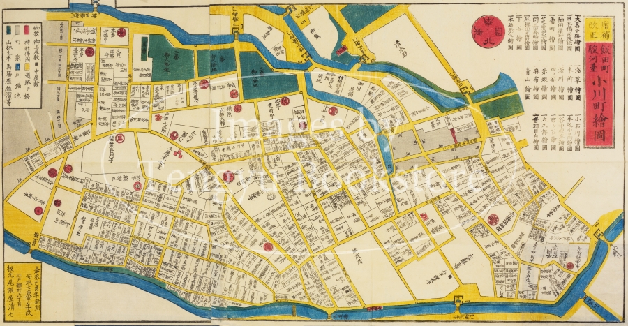 中でも江戸の書店 金鱗堂(尾張屋清七)によって出版された尾張屋版は代表的な江戸切絵図としてもっとも有名なもの。嘉永2年(1849年)に刊行を開始して以来、明治3年(1870年)まで改正と出版を続けた尾張屋版 江戸切絵図は、地図としての用途だけでなく、江戸土産としても喜ばれ、当時高い人気を博しました。