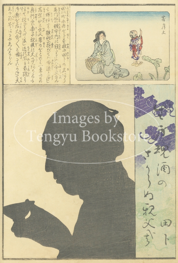 江戸末期の文化人たちの肖像影絵集「くまなき影」中の1ページ。「興画合」という文人たちの遊びの会を主宰していたパトロン波月亭花雪の3周忌記念として制作された本書は、「興画合」会の参加者たちを略伝と影絵を用いて紹介したもの。