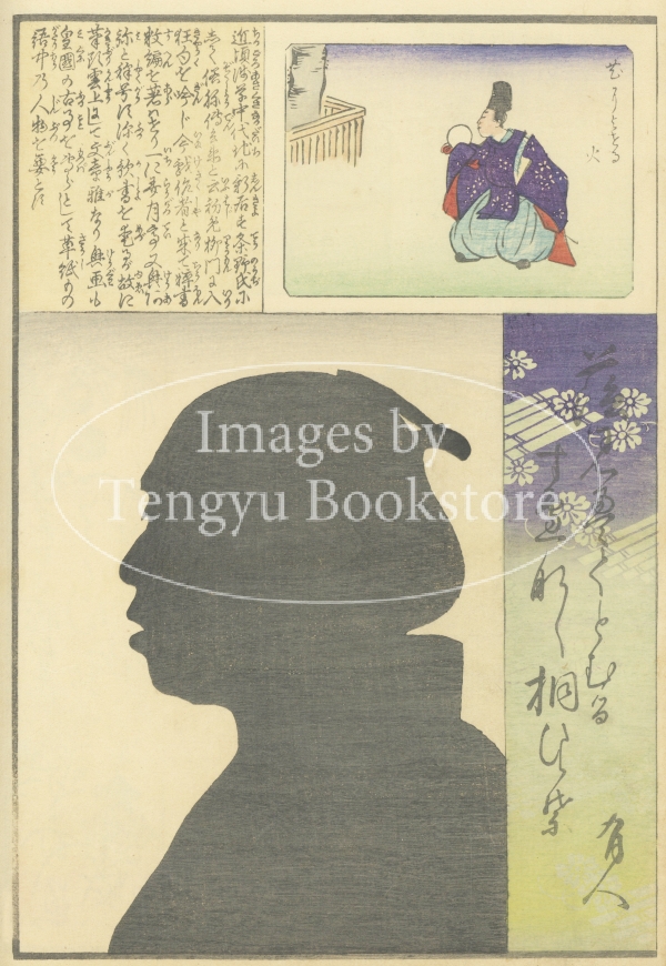 江戸末期の文化人たちの肖像影絵集「くまなき影」中の1ページ。「興画合」という文人たちの遊びの会を主宰していたパトロン波月亭花雪の3周忌記念として制作された本書は、「興画合」会の参加者たちを略伝と影絵を用いて紹介したもの。