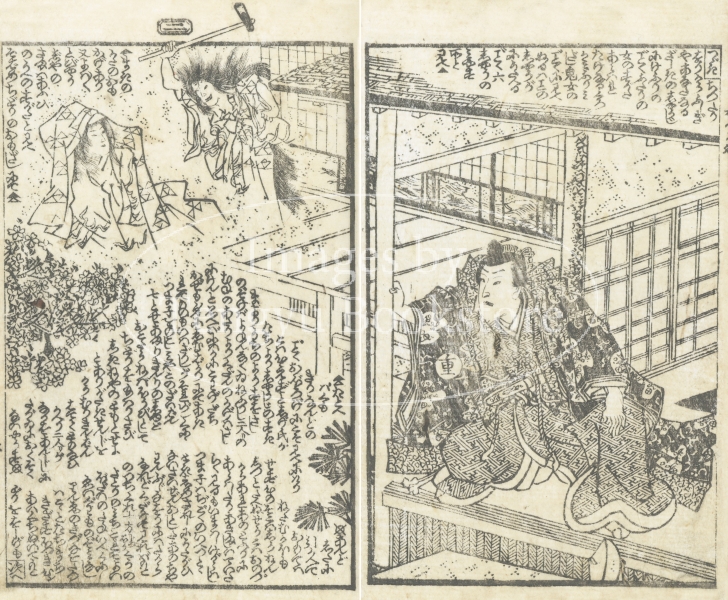 江戸時代後期の戯作者 墨川亭雪麿(1797-1856)と浮世絵師 歌川国光による草双紙「かるかや一代記」の1ページ。歌舞伎や浄瑠璃などでも扱われている僧侶 苅萱道心の伝説を題材にしたもの。