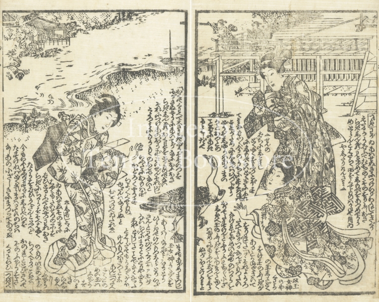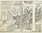 江戸時代後期の戯作者 墨川亭雪麿(1797-1856)と浮世絵師 歌川国光による草双紙「かるかや一代記」の1ページ。歌舞伎や浄瑠璃などでも扱われている僧侶 苅萱道心の伝説を題材にしたもの。