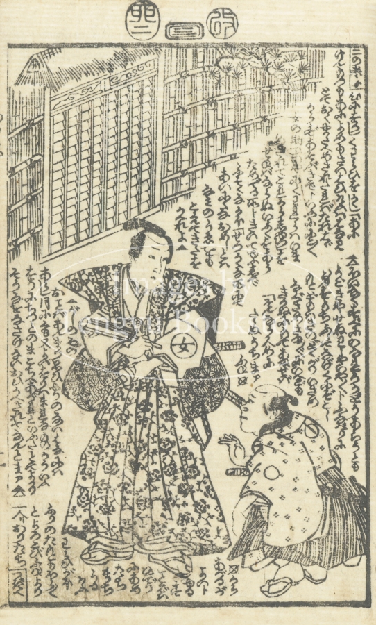 江戸時代後期の戯作者 墨川亭雪麿(1797-1856)と浮世絵師 歌川国光による草双紙「かるかや一代記」の1ページ。歌舞伎や浄瑠璃などでも扱われている僧侶 苅萱道心の伝説を題材にしたもの。