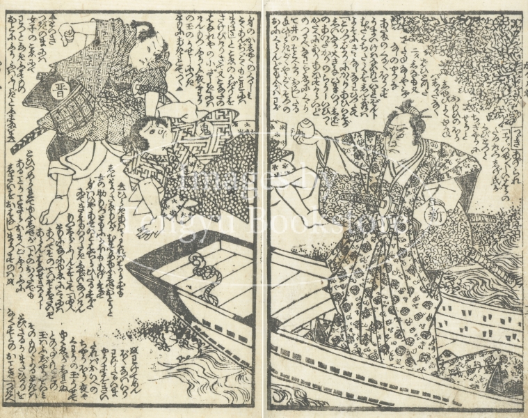 江戸時代後期の戯作者 墨川亭雪麿(1797-1856)と浮世絵師 歌川国光による草双紙「かるかや一代記」の1ページ。歌舞伎や浄瑠璃などでも扱われている僧侶 苅萱道心の伝説を題材にしたもの。