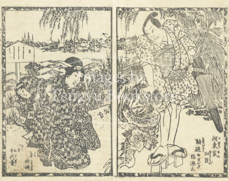 江戸時代後期の戯作者 墨川亭雪麿(1797-1856)と浮世絵師 歌川国光による草双紙「かるかや一代記」の1ページ。歌舞伎や浄瑠璃などでも扱われている僧侶 苅萱道心の伝説を題材にしたもの。