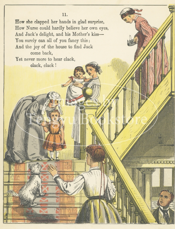 19世紀末イギリスの絵本画家ウォルター・クレイン(1845-1915)の初期の絵本「おしゃべりジャック」の挿絵。おしゃべりが過ぎる子供ジャックが、カササギにさらわれておしゃべりを反省するお話です。