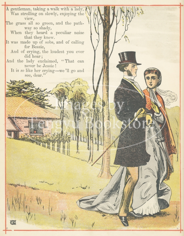 19世紀末イギリスの絵本画家ウォルター・クレイン(1845-1915)の初期の絵本「迷子になったジェシー」の挿絵。公園を散歩中に迷子になった少女ジェシーが得意の大声泣きによって見つけられるお話です。