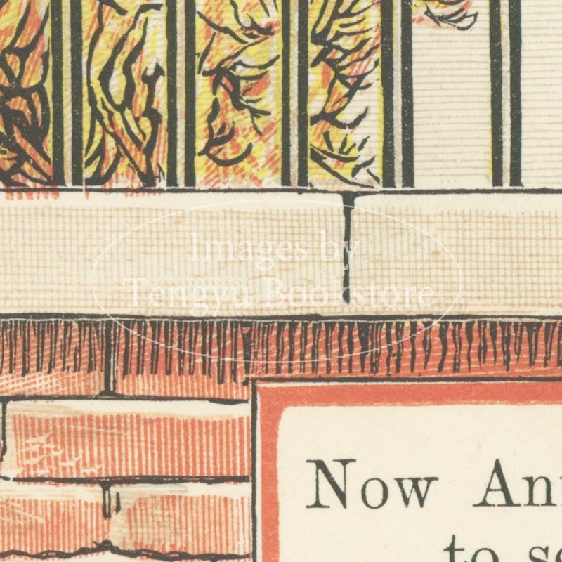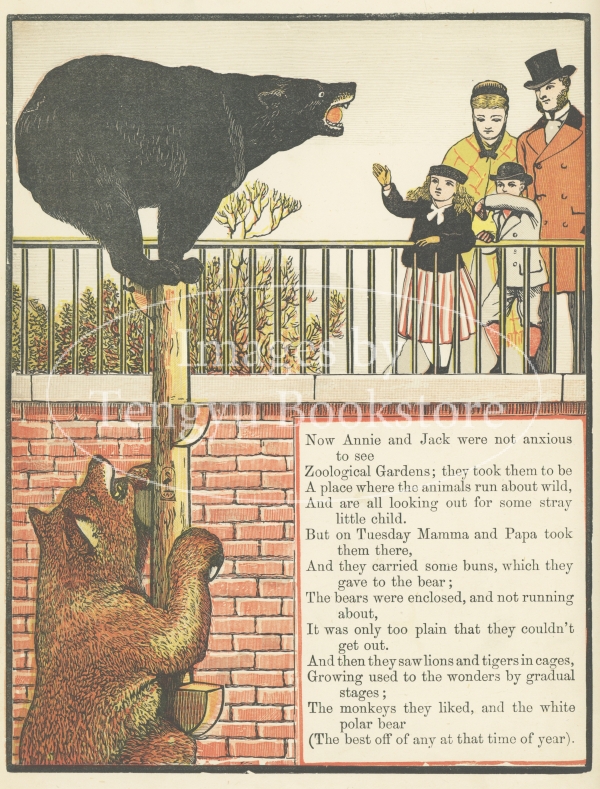 19世紀末イギリスの絵本画家ウォルター・クレイン(1845-1915)の初期の絵本「ロンドンのアニーとジャック」の挿絵。月曜から土曜まで毎日ロンドンに出かけることになったアニーとジャックのロンドン見物の様子を描いたもの。