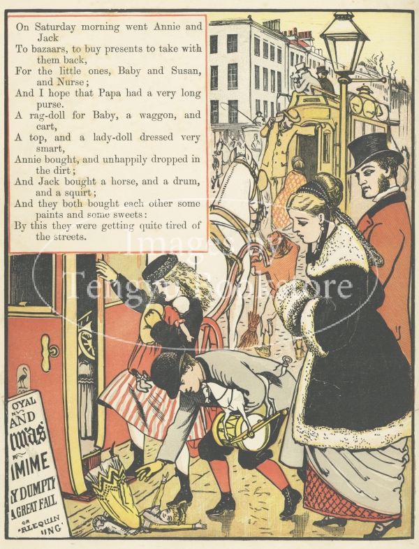 19世紀末イギリスの絵本画家ウォルター・クレイン(1845-1915)の初期の絵本「ロンドンのアニーとジャック」の挿絵。月曜から土曜まで毎日ロンドンに出かけることになったアニーとジャックのロンドン見物の様子を描いたもの。