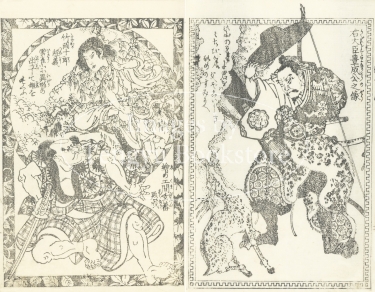 江戸時代後期の浮世絵師・戯作者 歌川貞秀(1807-1878)による草双紙「雲雀山蓮糸織(ひばりやまはちすのいとおり)」の1ページ。奈良の当麻寺に伝わる「当麻曼荼羅」を一晩で織ったとされる中将姫伝説を題材にしたもの。