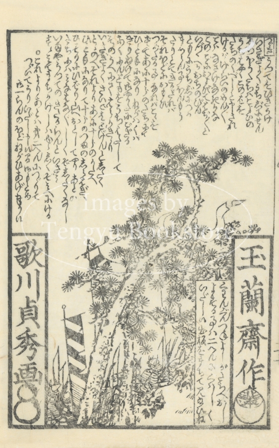 江戸時代後期の浮世絵師・戯作者 歌川貞秀(1807-1878)による草双紙「雲雀山蓮糸織(ひばりやまはちすのいとおり)」の1ページ。奈良の当麻寺に伝わる「当麻曼荼羅」を一晩で織ったとされる中将姫伝説を題材にしたもの。