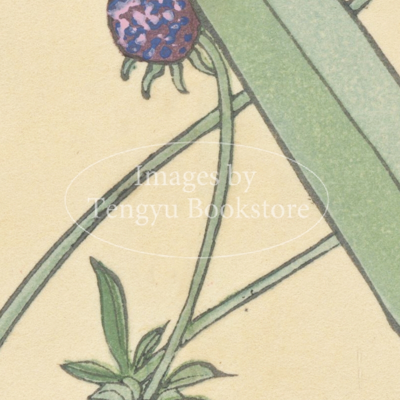 明治大正期の染色図案家 谷上広南(1879‐1928)による木版画集「西洋草花図譜」の1図。当時輸入された海外の草花をおよそ100点取り上げ、色鮮やかな木版画で描いた本作は、日本製のボタニカルアートとして人気の高い作品集です。