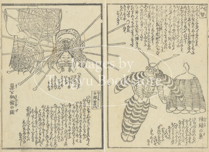 幕末・明治期の戯作者 瓢々亭泉成の滑稽本「有情雑話」からの一枚。本書は、様々な虫・鳥・動物を人間に見立て、面白おかしく紹介した擬人物語。