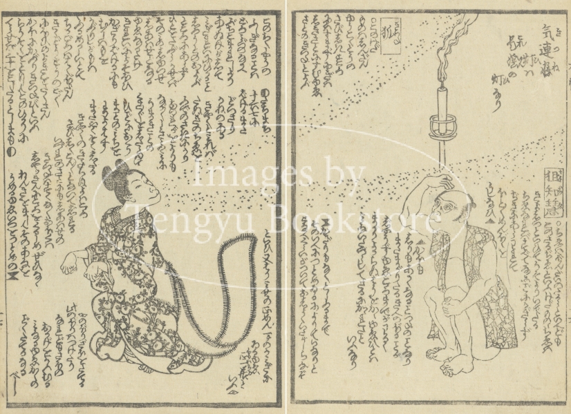 幕末・明治期の戯作者 瓢々亭泉成の滑稽本「有情雑話」からの一枚。本書は、様々な虫・鳥・動物を人間に見立て、面白おかしく紹介した擬人物語。