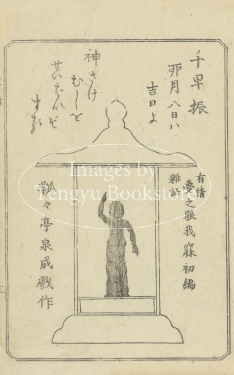 幕末・明治期の戯作者 瓢々亭泉成の滑稽本「有情雑話」の扉絵。本書は、様々な虫・鳥・動物を人間に見立て、面白おかしく紹介した擬人物語。