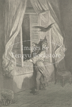 アメリカを代表する文学者のひとり、エドガー・アラン・ポー(1809-1849)の代表作「大鴉」に、19世紀における書物挿絵の大家ギュスターヴ・ドレ(1832-1888)が挿絵を添えた、豪華挿絵本「大鴉」収録の図版。