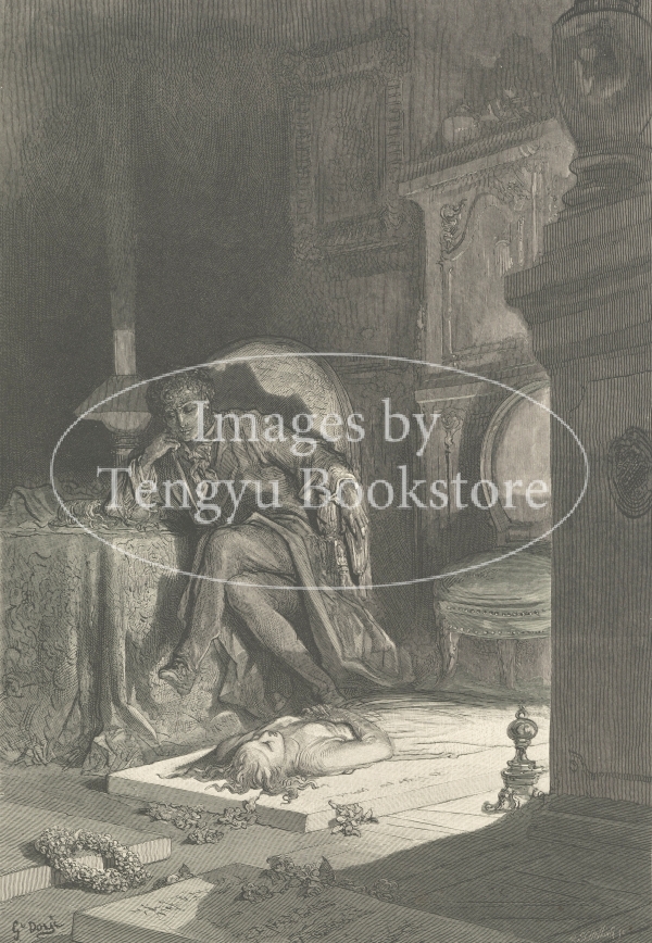 アメリカを代表する文学者のひとり、エドガー・アラン・ポー(1809-1849)の代表作「大鴉」に、19世紀における書物挿絵の大家ギュスターヴ・ドレ(1832-1888)が挿絵を添えた、豪華挿絵本「大鴉」収録の図版。